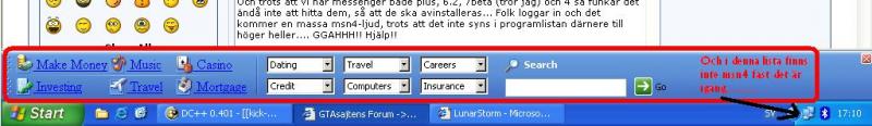 Henkibojj Skrivet 11 oktober, 2004 Rapportera Share Skrivet 11 oktober, 2004 vet inte om det här är den rätta msntråden, men min syrra installerar både det ena och det andra programmet till msn, vartenda ett sämre en det andra. Det är otroligt troligt ( ) att det är hon som får in en massa plugins och idiotgenvägar till skrivbordet. Så, är det nån som vet hur man får bort den här irriterande prylen (längst ner) som kom upp alldeles nyss, jag får inte bort den?? Krysset uppi hörnet funkar inte. Jag hittar det inte i programlistan (CtrlAltDel) eller processlistan. Det kommer upp en massa sökfält precis under adressfältet i tid och otid, dessutom. Och trots att vi har messenger både plus, 6.2, 7beta (tror jag) och 4 så funkar det ändå inte att hitta dem, så att de ska avinstalleras... Folk loggar in och det kommer en massa msn4-ljud, trots att det inte syns i programlistan därnere till höger heller.... GGAHHH!! Hjälp!! Citera Länk till kommentar Dela på andra sidor More sharing options...