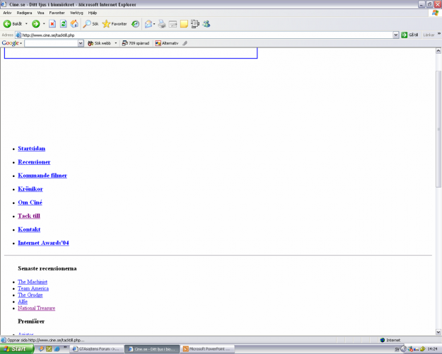 Curly Skrivet 9 januari, 2005 Rapportera Share Skrivet 9 januari, 2005 (redigerad) "Vi ber om ursäkt men du använder en webbläsare som inte Cine.se stödjer. Detta leder till att sidans grafiska utseende kan se konstigt ut och fungera sämre... Vi ber dig därför använda Internet Explorer. Vänligen Redaktionen på Ciné" Men blä, Firefox for life Redigerad 9 januari, 2005 av Curly Citera Länk till kommentar Dela på andra sidor More sharing options...