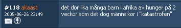 BroDD Skrivet 9 juli, 2005 Rapportera Share Skrivet 9 juli, 2005 Snacka me min kompis på msn för nån da sen.. då sa han typ såhär... rick: visste du att de vart ett nytt attentat? värre än world trace center jag: nej... eller jo, de där i london? rick: ja jag: lol, de va ju typ bara X som dog och X blev skadade (skrivit ett nummer då, kommer inte ihåg hur många, men så många som aftonbladet skrev ) rick: jaha, trodde de va värre än wtc... typ 15000 (:!!! Citera Länk till kommentar Dela på andra sidor More sharing options...