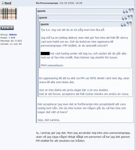 pKz Skrivet 25 juli, 2006 Rapportera Share Skrivet 25 juli, 2006 (redigerad) Hmm, vart ska man börja. Du är inte en person som ska läxa mig i språk. Vill jag svära även i textspråk så ska du bara va snäll nog och skita i det. Jag bryr mig inte även om du så skulle vara påven. Det är mitt sätt att förmedla mig och det är så det kommer att förbli. Att du även ska blanda in vad jag säger till folk i WoW topicen ser jag inte varför det ska vara nödvändigt. Jag ser mig själv som en väldigt allmänbildad person inom WoW och gillar att lära folk och ge folk råd och tips, men som sagt på mitt vis. Jag är ingen jävla dagisfröken. Haha, men det står i reglerna för helvete, varför ska du få säga saker vi inte ska få? Ska du inte vara en förebild för oss? "Men snälla lilla pelle. Du ska hålla skeden med högerhand. Såja, nu kommer flygplanet." Ang. regler och skit så kan man säga att jag står över lagen så att säga. Min plats i moderatorkåren tog jag frivilligt som en kul grej i början, men växte tillslut till ett mer eller mindre heltidsjobb som inte kommer ta slut fram tills jag slutar. Vilket inte är på ett tag iaf. Har jag tur så försvinner ju slummen snart.. WTF? Om du nu har det som ett "heltidsjobb" så kan du väl ge upp med kaxigheten eftersom det är som ett "heltidsjobb" för oss med, där vi försöker prata om saker osv. Du kan se mig som en person i den mytomspunna "Baseboll ligan". Det var på 80-talets stockholm då en grupp poliser med baseboss mössor som, om dom såg tjuvar göra brott tog med dom in i piketen och misshandlade dom och sen slängde ut dom utanför stam. Det som gjorde dom mest kända var för 2 utan "medlemmarna" slog ihjäl en person, men eftersom dom var en del av polisen så blev dom aldrig dömda och personen som dog hade enligt rättsläkare dött av att "Trilla" in i ett bord. Dom stog alltså ÖVER lagen, även fast dom ändå var en del utan den då dom var utbildade poliser. Okej? Fattade ingenting av det där. Jag är Admin, och jag står då över reglerna, även om jag ska följa dom egentligen. Dels så är jag immun mot andra admins och moderatorer då jag inte har en warning-meter så jag inte kan bli bannad/hybernatad så kan jag därimot banna/hybernata moderatorer. Ja, det förstår jag med. Men bara för att du är immun så ska du inte hålla på och svära och allt möjligt, precis som jag sagt innan. Bara för att jag är admin på beffo så sitter jag inte och fuskar på CS, eftersom jag också är immun? Sen ska man ta allt med en nypa sallt. Det är inte precis så jag kallar alla medlemmar saker, utan mest dom jag inte gillar. T.ex. dig. Inget som man ska hålla inom sig. Det är inte så konstigt att bland 8.000 personer så kan man inte gilla alla. Det är mänskligt ömöjligt. Sen hur man visar det beror från person till person, och ja. Du har väl fått ett ganska bra intryck av hur jag visar det. Så om du träffar en kille på stan, som du verkligen inte gillar alls, så börjar du kalla han miffo och idiot, bara för att du inte gillar han? Jag gillar inte dig heller, inte ett piss faktist, och jag säger inga svordomar till dig. Men det är ju ditt sätt och prata på, eller ? "Coolt." @okka: Din hybernate kan ifrågasättas, men allt ditt lull lull spam som vi lät dig skriva var mer än väl värt 40 dagar med vatten och bröd. Och alla er 7/5 personer. Det är inte precis så ni kan få HUR många varningar som hellst. Nån dag när ni minst anar det så ser ni den fina "OFFLINE. Your account have been suspended.". / pKz \m/ Redigerad 25 juli, 2006 av pKz Citera Länk till kommentar Dela på andra sidor More sharing options...