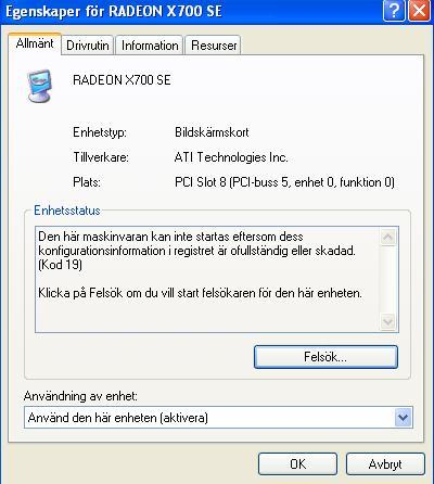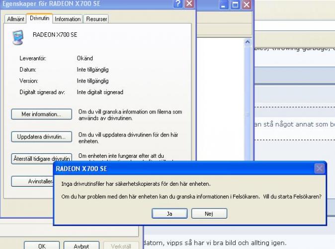 R2D2 Skrivet 25 augusti, 2007 Rapportera Share Skrivet 25 augusti, 2007 När jag tryckte på Återställ tidigare drivrutin så kom det här meddelandet upp? Vad betyder fistat? Det du skulle kunna göra är att avinstallera båda X700 och sen starta om, då borde Windows installera dom igen. Citera Länk till kommentar Dela på andra sidor More sharing options...